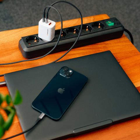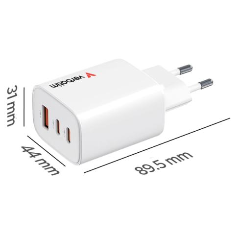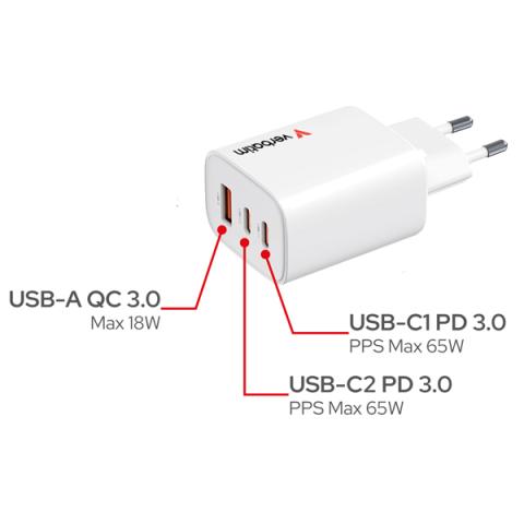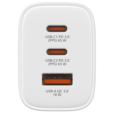 Descrizione / dati tecnici: Tecnologia GaN (nitruro di gallio) per maggiore efficienza e dimensioni compatte,Carica fino a 3 dispositivi contemporaneamente,2 porte USB-C Power Delivery (PD 3.0),1 porta USB-A per la ricarica rapida (QC 3.0) ,Fornisce fino a 65 W di potenza totale, ideale per laptop, smartphone e tablet,ngresso universale da 100-240 V: ideale per casa, ufficio o viaggi.