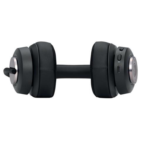 Design over-ear con cuscinetti in memory foam in gel foderati con tessuto traspirante con trasferimento del calore, archetto regolabile, un microfono rotante (fino a 270°) che può essere indossato a destra o a sinistra, e giunti rotanti che consentono di ruotare i cuscinetti fino a 90° per una regolazione comoda e sicura.