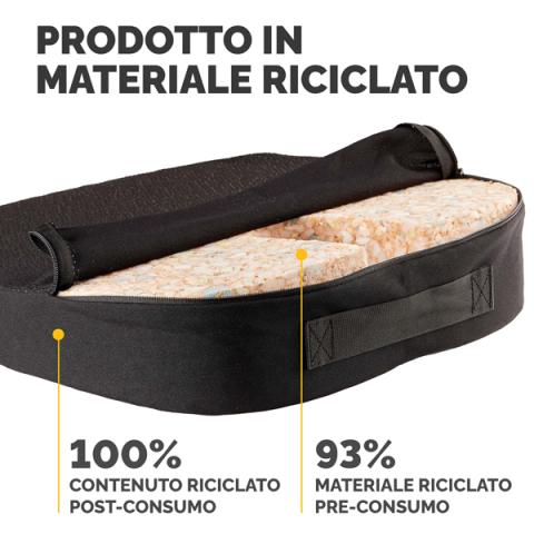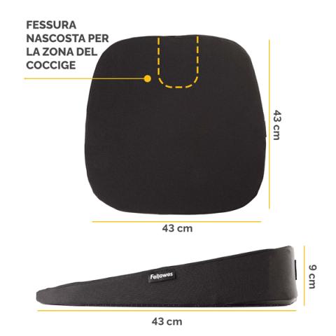 Descrizione / dati tecnici: Il design a cuneo favorisce il corretto posizionamento pelvico e l'allineamento spinale per aiutare a ridurre il disagio alla schiena. Il discreto taglio per il coccige nascosto nella base aiuta ad alleviare la pressione alla base della colonna vertebrale. Maniglia di trasporto integrata per un facile trasporto ovunque tu lavori. Schiuma realizzata con il 93% di materiale riciclato pre-consumo, con conseguente riduzione dell'impatto ambientale rispetto a una schiuma vergine. Rivestimento in tessuto realizzato al 100% in poliestere riciclato post-consumo. Ergonomicamente testato da FIRA International come adatto allo scopo.Dimensioni: 9x43x43 cm