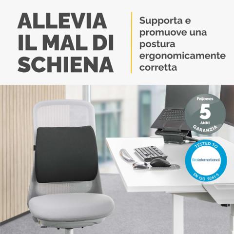 Descrizione / dati tecnici: Progettato per aiutare a ridurre il disagio alla schiena fornendo supporto e incoraggiando una corretta postura ergonomica. La cinghia regolabile facile da usare mantiene il supporto saldamente in posizione. Maniglia di trasporto integrata per un facile trasporto ovunque tu lavori. La schiuma contiene contenuto riciclato post-consumo da m aterassi. Rivestimento in tessuto realizzato al 100% in poliestere riciclato post-consumo.rgonomicamente testato da FIRA International come adatto allo scopo. Dimensioni 33x 38 x 9 cm