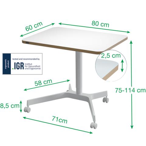 Descrizione / dati tecnici: La scrivania è progettata per un uso flessibile e come spazio di lavoro temporaneo, perfetto per l'home office, le aree di hot desking o le sale riunioni. Regolazione pneumatica assistita dell'altezza da 75 a 114 cm, facile da usare, per adattarsi a tutte le taglie e a tutte le esigenze.4 ruote bloccabili a 360° adatte a tutti i tipi di pavimento (piastrelle, laminato, legno, moquette). 80 x 60 x 2,5 cm di superficie di appoggio con un carico massimo di 20 kg per contenere un computer portatile con supporto, tastiera, mouse e poggiapolsi. La scrivania è progettata per un uso flessibile e come spazio di lavoro temporaneo, perfetto per l'home office, le aree di hot desking o le sale riunioni.