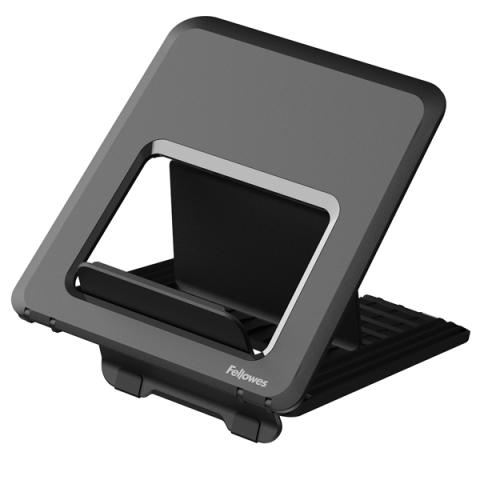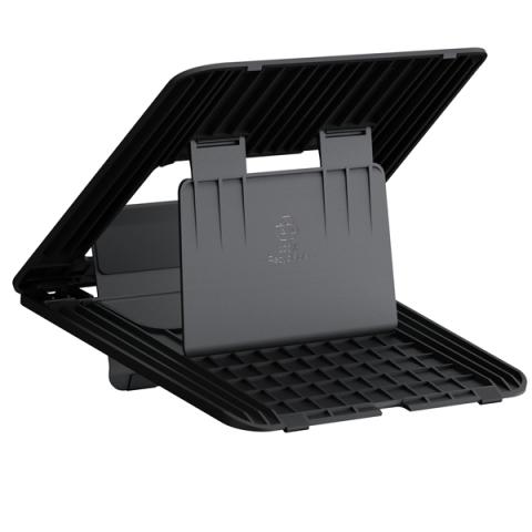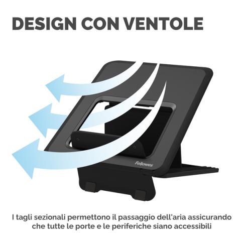 Descrizione / dati tecnici: Dodici regolazioni di altezza con gambe frontali ripiegabili per ottimizzare la posizione dello schermo di qualunque laptop.Sostiene laptop fino a 14’’ e di peso massimo di 4kg.Materiali 100% riciclabili e con garanzia limitata 5 anni.Dimensioni prodotto;1.40 x 23.50 x 26.80