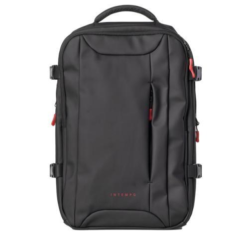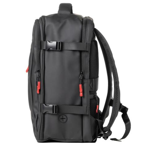 Descrizione / dati tecnici: Zaino in gomma antipioggia, tasca frontale portachiavi e tasca frontale portadocumenti. Grande vano centrale con tasche porta accessori, presa esterna per cuffie. Tasca posteriore porta notebook 15”. Tasca posteriore e nastro per inserimento su trolley. Tracolle e schienale imbottite e dotato di maniglia di trasporto. Cinghie laterali per compressione. Bagaglio a mano approvato Ryanair.