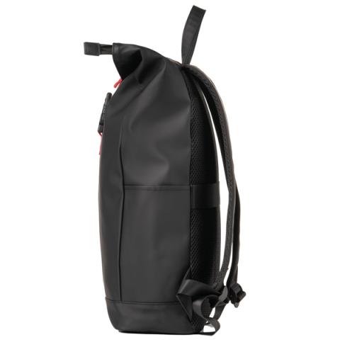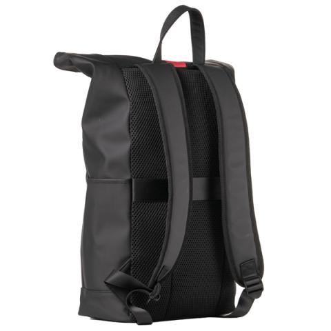 Descrizione / dati tecnici: Zaino roll-top in gomma antipioggia, tasca frontale portachiavi e accessori. Grande vano centrale con all’interno guscio estraibile per notebook 15”. Doppia tasca laterale per borraccia e ombrello, schienale e tracolle imbotite, maniglia per il trasporto.