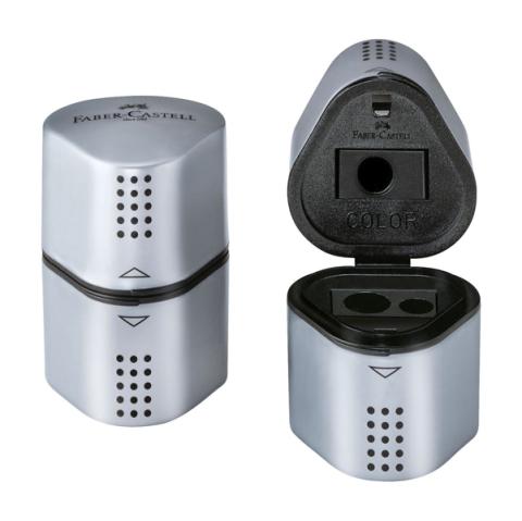 Descrizione / dati tecnici: Tempera matite in plastica grigia a 3 fori per matite standard, jumbo e colorate. Adatto per temperare tutte le matite rotonde, triangolari ed esagonali. Dotato di doppio serbatoio. Color argento.