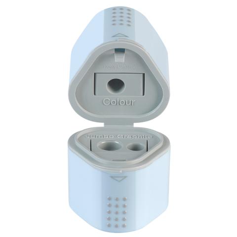 Descrizione / dati tecnici: Tempera matite in plastica grigia a 3 fori per matite standard, jumbo e colorate. Adatto per temperare tutte le matite rotonde, triangolari ed esagonali. Dotato di doppio serbatoio.