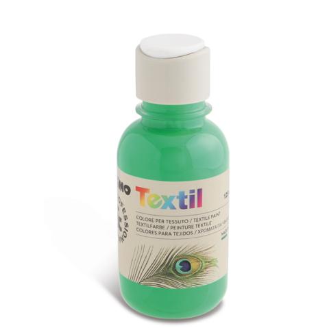 Descrizione / dati tecnici: Colore per tessuto in bottiglia da 125 ml con tappo dosatore in espositore da 6 colori (vermiglione, giallo, blu oltremare, verde brillante, bianco e nero). Colore ad acqua ad alta concentrazione di resina e pigmento, una volta asciutto è permanente sui tessuti. Non necessita di fissaggio ma deve essere lasciato asciugare perfettamente per almeno 24 ore. Stirare dal rovescio.