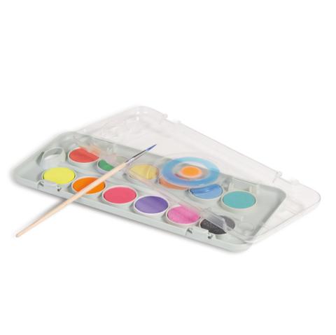 Descrizione / dati tecnici: Pastiglie acquerello fluo e metallizzato ottenute comprimendo polveri ad alto contenuto di pigmento, di qualità speciale, in scatola in plastica da 12 colori, con pratico coperchio tavolozza e pennello. Diluite con poca acqua permettono di ottenere stesure coprenti e brillanti. Utilizzabile per la tecnica classica su fogli di carta o cartoncino da acquerello e per tecniche particolari anche su supporti diversi. Compatibile con gli altri prodotti ad acqua delle linee Morocolor.