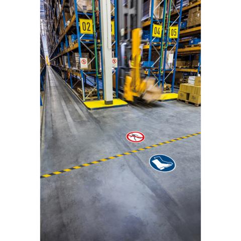 Descrizione / dati tecnici: Segnaletica da terra per l'identificazione di aree pericolose, spazi di stoccaggio, passaggi pedonali ecc. Resistenza allo scivolamento R9 e conforme alla normativa DIN 51130. Conforme alla normativa UNI EN ISO 7010. Pittogrammi di sicurezza autoadesive per applicazioni su pavimenti in ambienti interni, come magazzini, centri di distribuzione, produzione, ecc. Resistente all'abrasione.
