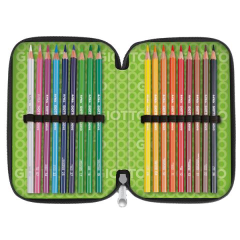 Descrizione / dati tecnici: Astuccio a 3 scomparti in poliestere 900D impermeabile dotato di cerniera in metallo. Contenuto: 1 colla stick da 10gr, 1 righello 15cm, 1 maxi gomma No-Sign, 1 temperamatite c/serbatoio, 1 forbice, penna Tratto Cancellik rosso e blu, 1 penna Tratto Uno Green nero, 1 matita HB, 1 Matita 2B, 18 pennarelli Turbo Color e 18 pastelli Stilnovo mina 3,3mm.